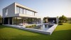 Het terras met zwembad en poolhouse biedt een overdekte buitenzitruimte en een overdekte eetruimte, beiden in contact met het zwembad en het landschap.